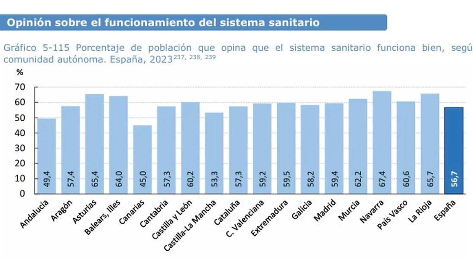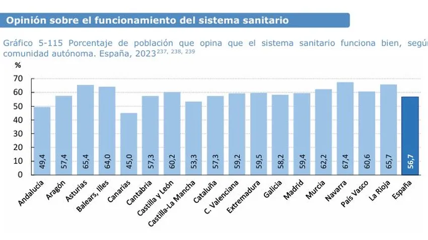 En 2023, el 56,7% piensa que el sistema sanitario español funciona bien o bastante bien frente al 72,1% que así lo manifestaba en 2019. Además, el 14,3% opina que necesita cambios profundos frente al 4,1% en 2019. El grado de satisfacción con la participación en las decisiones de salud en Ceuta y Melilla no viene reflejado, a diferencia del resto de comunidades de España.