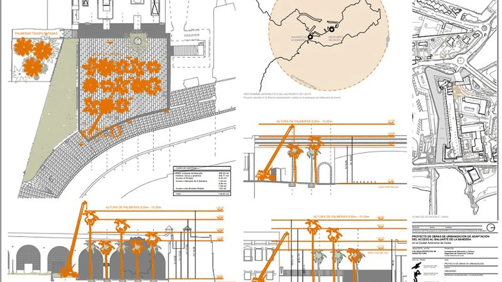 Por otro lado, los documentos muestran que el proyecto acompaña a la actuación llevada a cabo en el Baluarte de la Bandera, que se materializa y conforma en 3 etapas diferenciadas y sucesivas en el tiempo: restaurar, rehabilitar y reconfigurar. Así, estas tres operaciones materializan la intervención sobre el Baluarte de la Bandera y que debe acompañar la presente propuesta. La materialización de estas ideas se realizan de la siguiente forma: retirada del cierre de separación del espacio demanial entre el Baluarte de la Bandera y la ciudad de Ceuta, traslado y/o retirada de la vegetación existente, levantamiento de los parterres laterales, pavimentos y mobiliario urbano existente, materialización y acondicionamiento de los accesos al Complejo de las Murallas Reales de la Puerta Califal; así como la separación con el Parador Nacional de Turismo continuando el cierre medianero existente, reordenación urbana de parterre lateral medianero con el Cuartel y con el Parador Nacional, así como plantación de la gran sala exterior hipóstila de Palmeras, pavimentación y resolución de recogida de aguas de pluviales en espacio exterior de nueva configuración, así como mobiliario urbano e iluminación. Cabe recordar que la finalidad y objeto del proyecto es adaptar el acceso al Baluarte de la Bandera y Bóvedas Anejas como Centro de Interpretación de la Ciudad Autónoma de Ceuta, generando un nuevo espacio público.