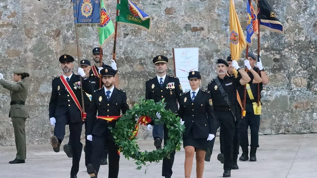 En el emblemático lugar de las Murallas Reales, en pleno corazón de Ceuta y presidido por la Enseña Nacional que el Gobierno de la Ciudad le otorgó hace unos meses por su Bicentenario, la Policía Nacional de Ceuta celebraba en la tarde de este miércoles el Día de su Patrón, Santos Ángeles Custodios, ante el cariño y respaldo de las principales autoridades civiles y militares de la ciudad, a la que no faltaron, entre otros, el presidente Vivas o la delegada del Gobierno, Cristina Pérez, además del comandante general, los jefes de Guardia Civil y Policía Local y miembros de la Asamblea de Ceuta. Así, se procedió a reconocer la labor de los policías más destacados del último año y a aquellas personas o instituciones que han impulsado la imagen de la Policía Nacional por sus actos, además de rendir honores a los que dieron su vida por España y fallecieron en los últimos 365 días del año.