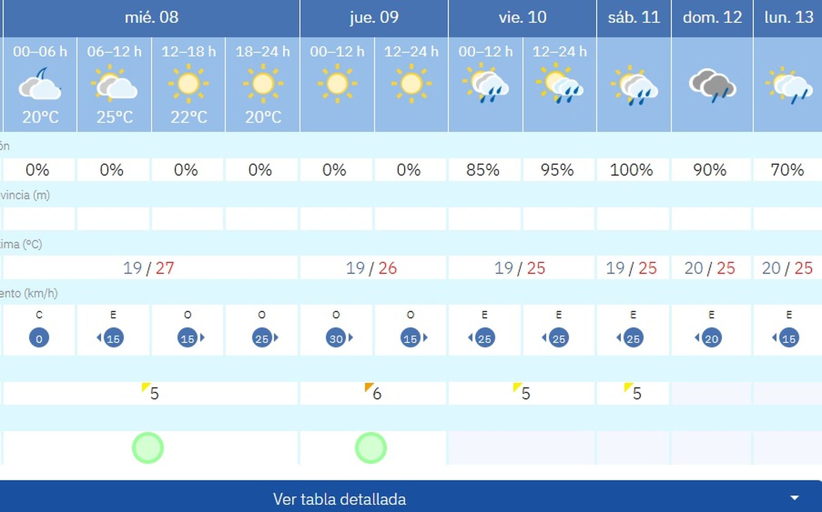 El viernes 10 marcará el inicio de un periodo inestable, con probabilidad de lluvia del 85 al 95% y un ligero descenso de las temperaturas. Se esperan chubascos intermitentes que continuarán durante el sábado y el domingo, cuando la AEMET prevé una probabilidad de precipitación del 100% y 90%, respectivamente.