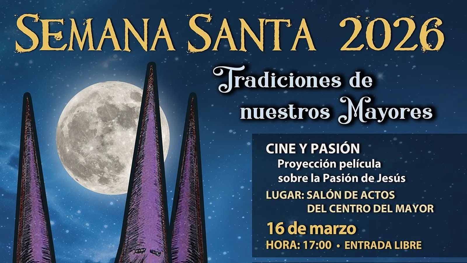La primera actividad será la proyección de una película sobre la Pasión de Jesús, que tendrá lugar el día 16 de marzo a las 17.00 horas en el Salón de Actos del Centro del Mayor. La entrada es gratuita.