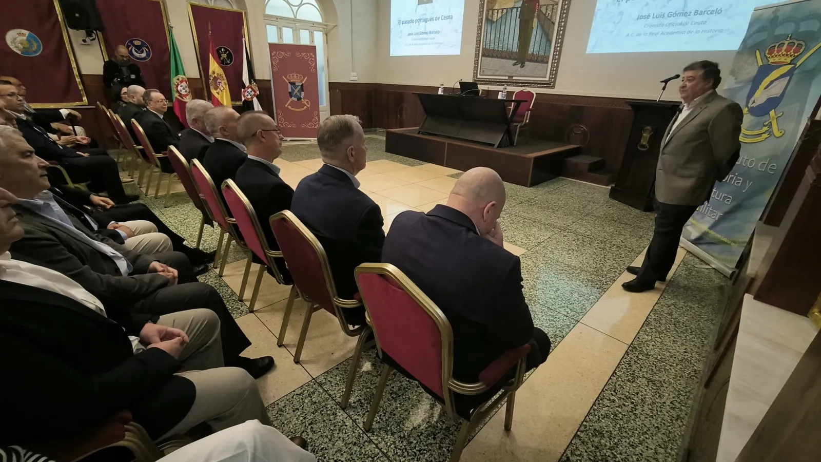 La herencia portuguesa en Ceuta es, seis siglos después, uno de los pilares fundamentales sobre los que se asienta la identidad de la ciudad. Este ha sido el argumento de la conferencia ofrecida esta tarde por el cronista oficial de Ceuta, José Luis Gómez Barceló, bajo el título “El pasado portugués de Ceuta”, en el marco de las actividades organizadas por el Instituto de Historia y Cultura Militar. El cronista ha contado entre el auditorio con la presencia de una delegación del Departamento de Historia y Cultura Militar de Portugal liderada por el general Antonio Joaquim Ramalhôa Cavaleiro.