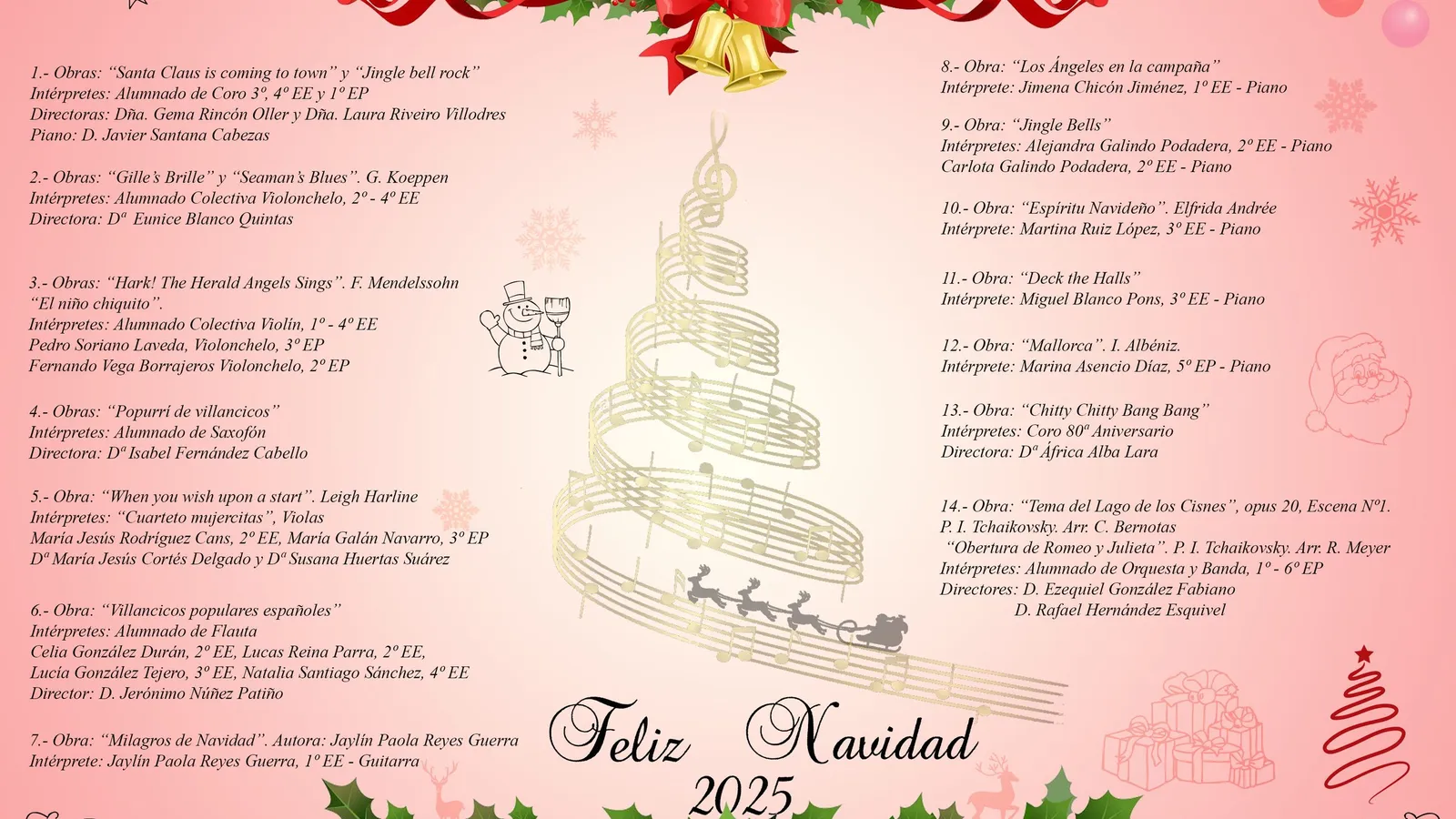 El programa incluye además la obra “Milagros de Navidad”, escrita e interpretada por Jaylin Paola Reyes Guerra (1.º EE, guitarra), así como piezas pianísticas como “Los Ángeles en la campaña”, “Jingle Bells”, “Espíritu Navideño”, “Deck the Halls” y “Mallorca”, de I. Albéniz.
