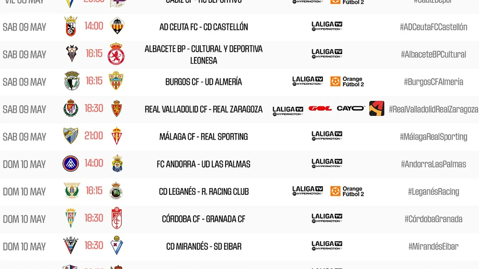 AD Ceuta-Castellón, el día 9 de mayo a las dos de la tarde