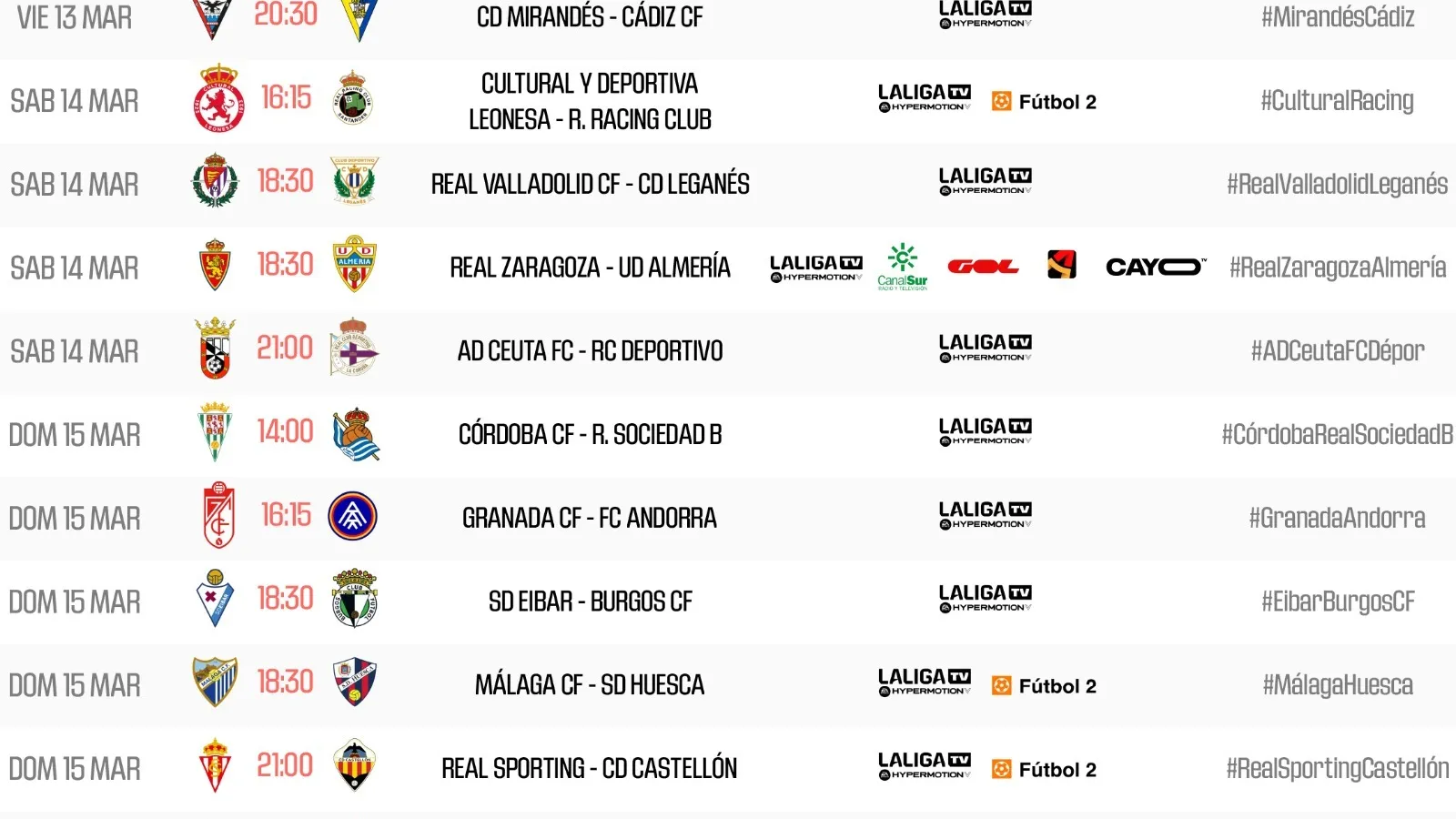 LaLiga ha dado a conocer los partidos de la trigésima jornada de la Liga Hypermotion
