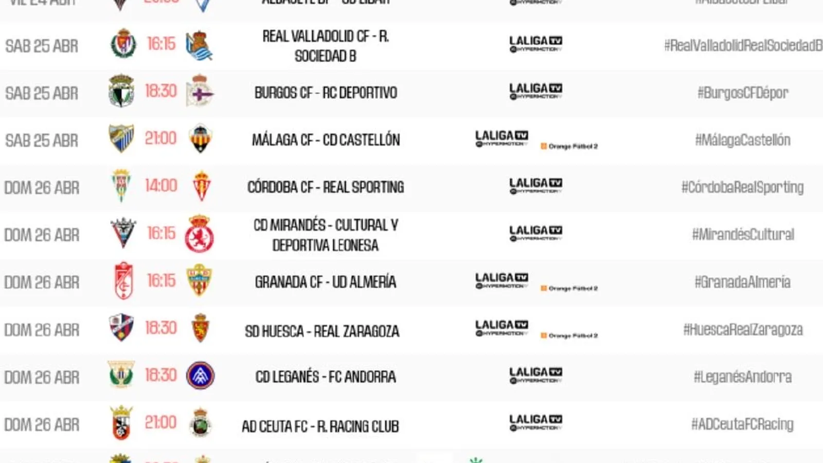 LaLiga ha sado a conocer los horarios de la trigésima séptima jornada de la Liga Hypermotion