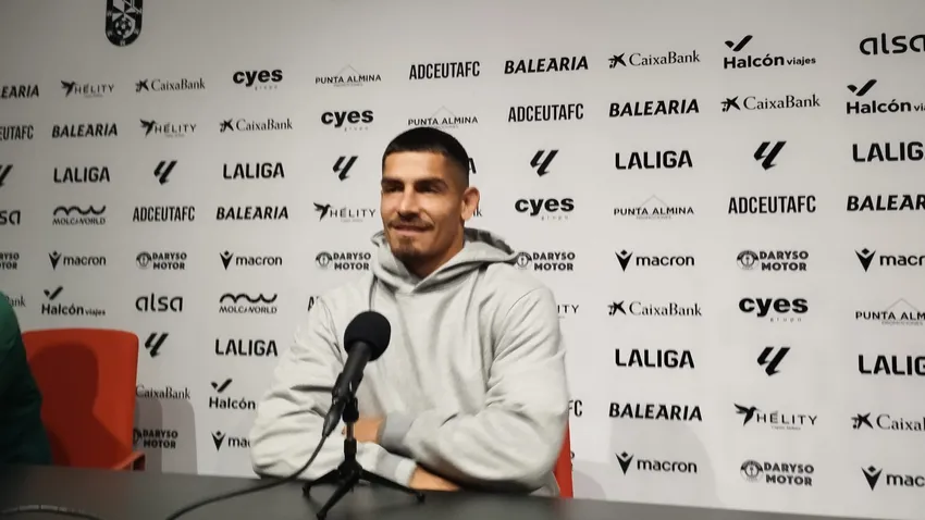 El portero Guille Vallejo compareció en la rueda de prensa antes del partido frente a la Cultural Leonesa, equipo donde jugó una campaña en la temporada 2026-17 en Segunda B.