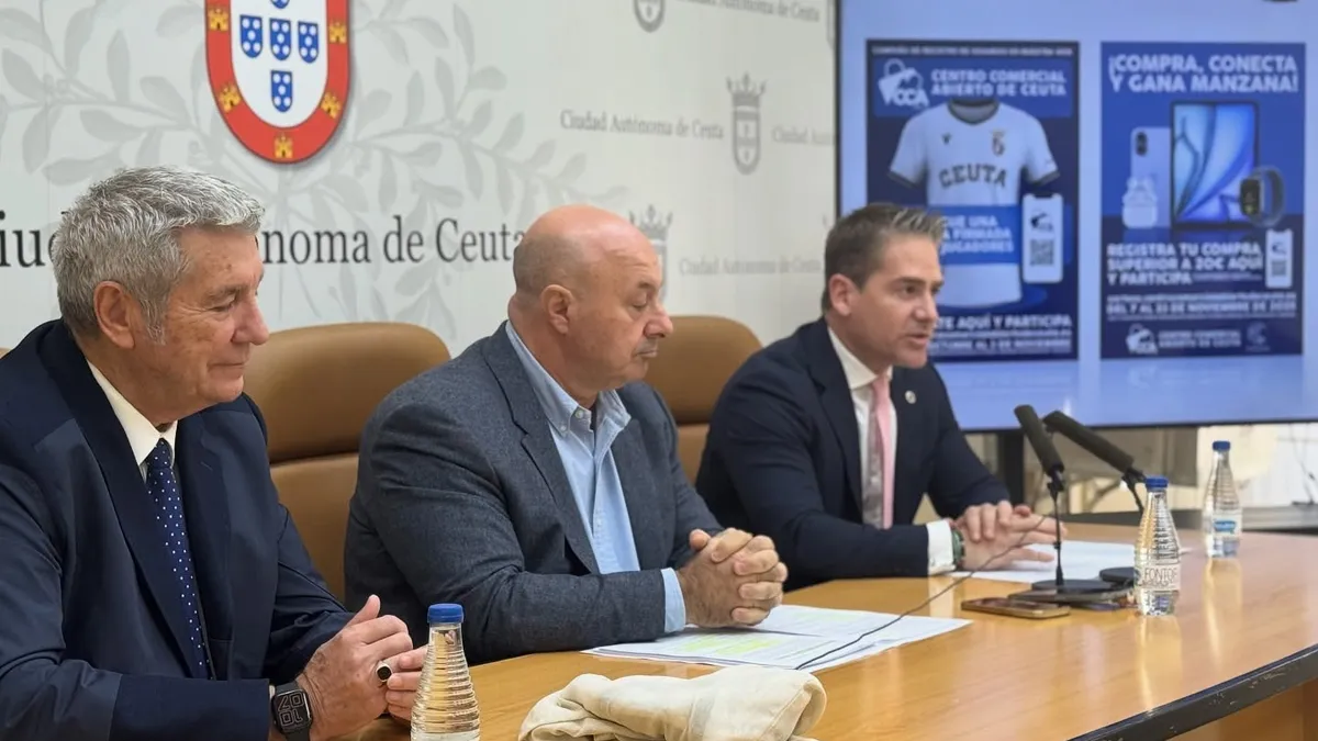 En la mañana de este viernes, la Consejería de Turismo presentó a los medios de comunicación dos convenios de 20.000 euros cada uno formalizados con el Centro Comercial Abierto y con la Cámara de Comercio de Ceuta. El consejero Nicola Cecchi y los presidentes de ambas entidades, Juan Torres y Karim Bulaix respectivamente, explicaron las diferentes iniciativas destinadas al fomento de la compra en los comercios locales ceutíes para estas navidades en sala de prensa del Palacio de la Asamblea. También se hizo entrega de una camiseta de la AD Ceuta a Ana, la ganadora de un sorteo del centro comercial.