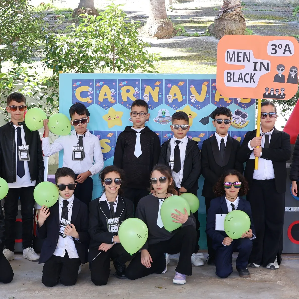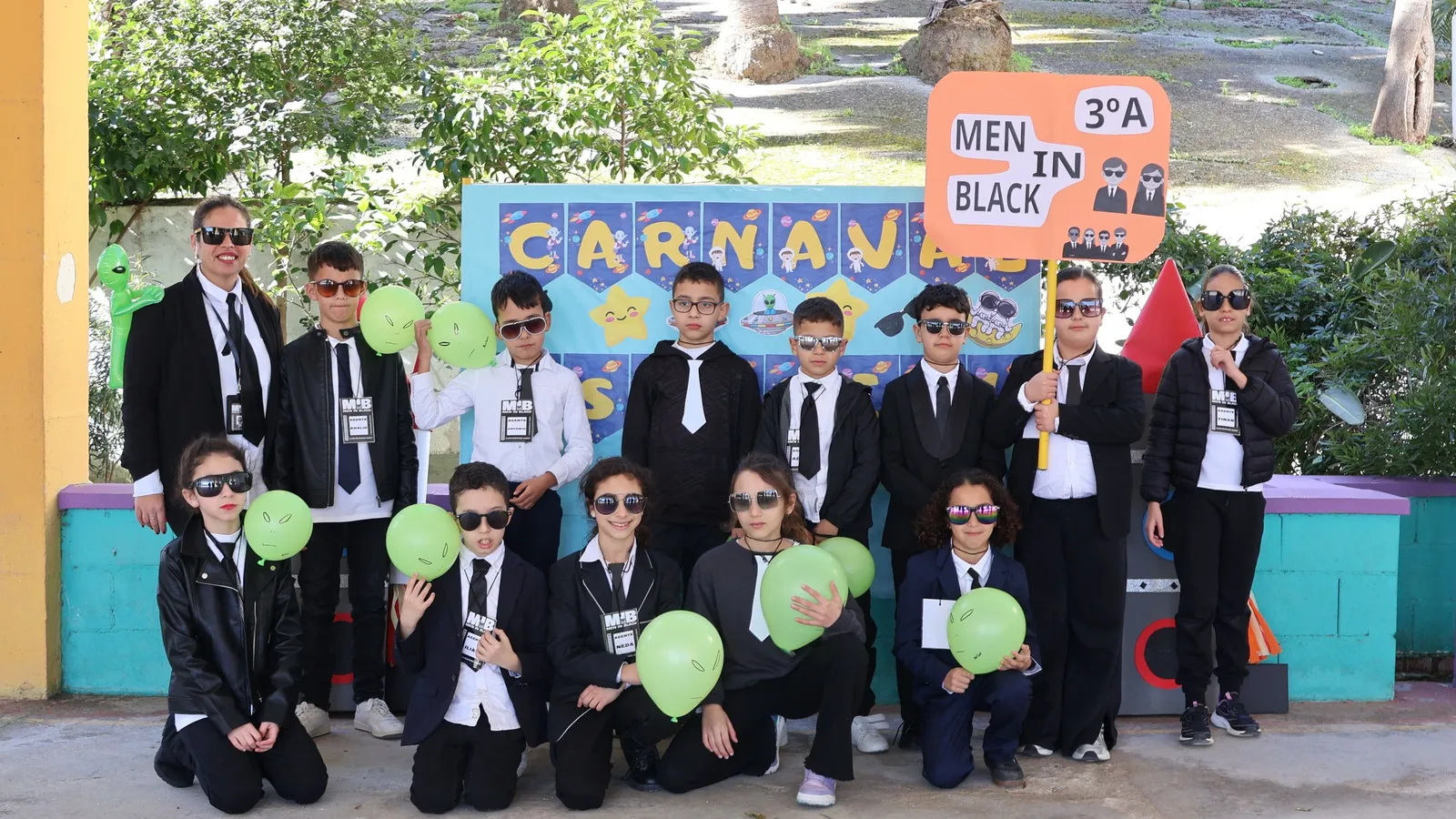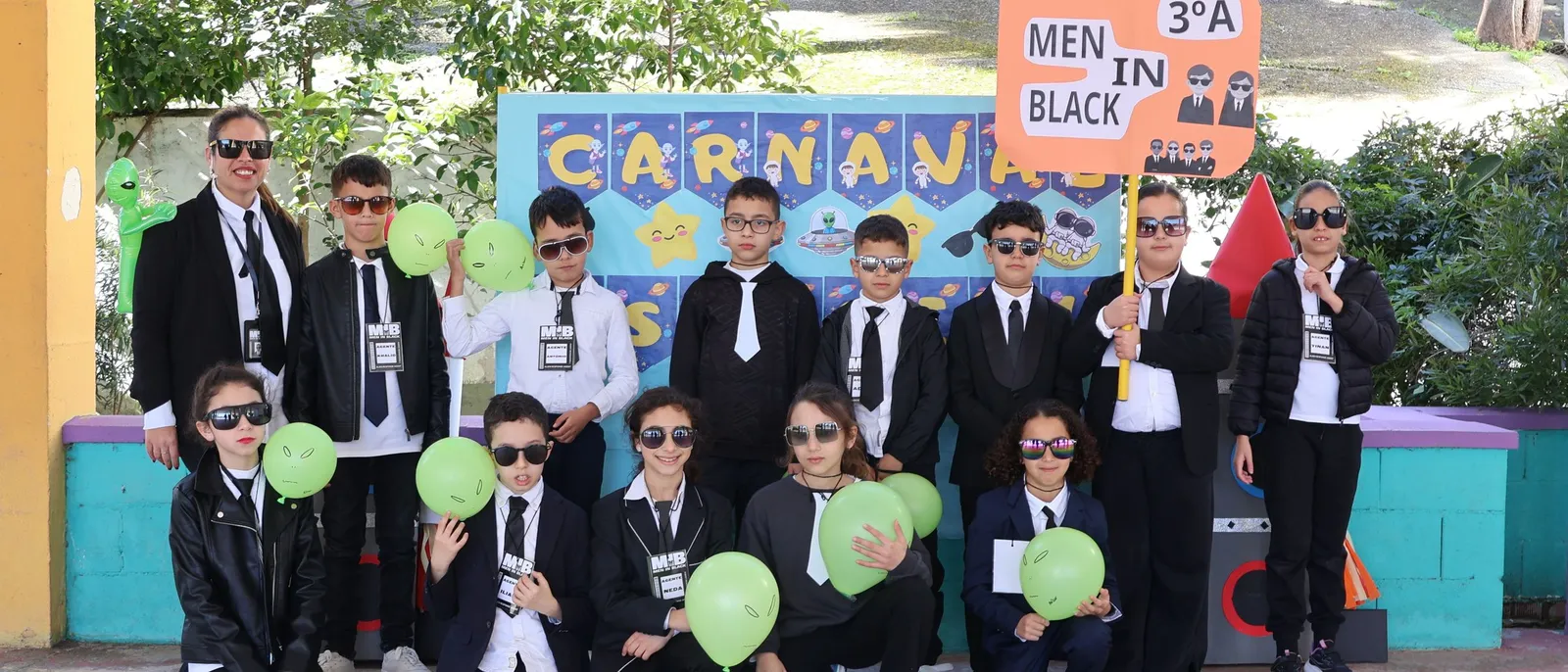 Según explica el colegio "La jornada comenzó con un despliegue de color y originalidad. Desde los más pequeños de Infantil, transformados en estrellas, hasta los alumnos de Primaria en galaxias, meteoritos, astronautas, extraterrestres y los Men in Black. Todos lucieron sus disfraces al ritmo de la música mediante un desfile de otra dimensión. También participaron los alumnos de 5º y 6º del CEIP Ramón y Cajal que se encuentran ubicados en el centro hasta la finalización de las obras de su colegio. Cada clase tenía su cartel identificativo y su propio eslogan. Se escucharon algunos como: "Yin, ¡Bienvenido al planeta tierra!", "Con gafas oscuras y traje formal, cuidamos la Tierra de todo mal", "Somos los meteoritos de primero, en carnaval brillamos como el cielo", "Tripulación unida, misión cumplida".