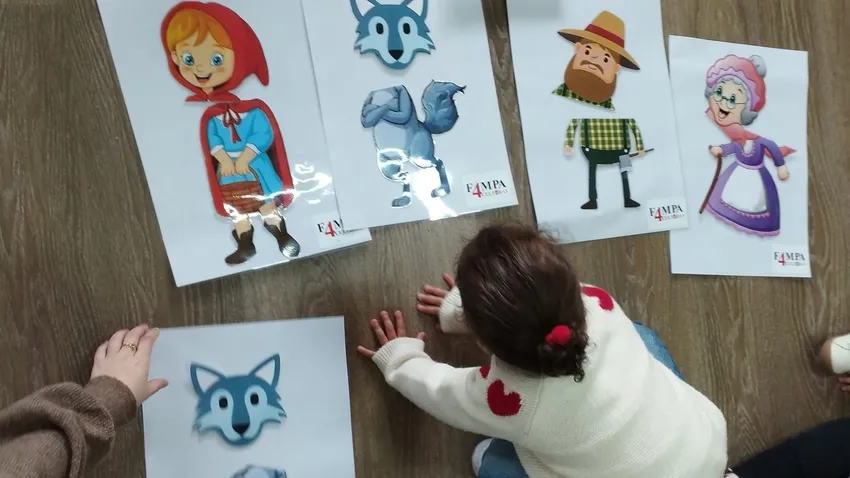 Durante el taller, los menores participaron igualmente en actividades complementarias como música y dinámicas con láminas interactivas. Entre ellas, los niños tuvieron la oportunidad de recomponer a los personajes principales del cuento —Caperucita, el lobo, la abuela y el cazador— uniendo las diferentes partes de las figuras mediante velcro, lo que contribuye a trabajar la motricidad fina y la coordinación.