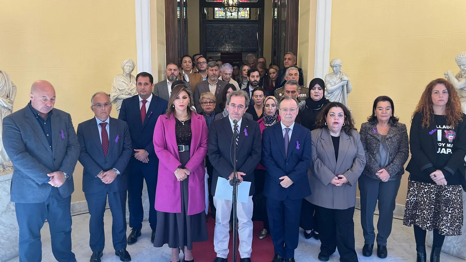 “Que este manifiesto no sea solo una lectura institucional, sino una llamada a la acción. Que se escuche en las aulas, en los medios, en los hogares, en las calles. Porque la igualdad no es un destino, es un camino que se recorre cada día. Y solo lo lograremos caminando juntos: mujeres y hombres, instituciones y ciudadanía, compartiendo la convicción de que una sociedad libre de violencia no es una utopía, sino una obligación moral y democrática”. Esta declaración de intenciones corresponde a los últimos retazos de la declaración leída tanto en el pleno como, más tarde, tras concluir el acto en el que se reconoció la trayectoria del magistrado. En esa última ocasión, el texto fue reproducido por el presidente del Colegio Oficial de Farmacéuticos de Ceuta, Mario de Miguel. Lo hizo a las once en punto, en la Puerta Noble del Ayuntamiento, acompañado de numerosas autoridades civiles y militares, que guardaron un minuto de silencio al término de la lectura.