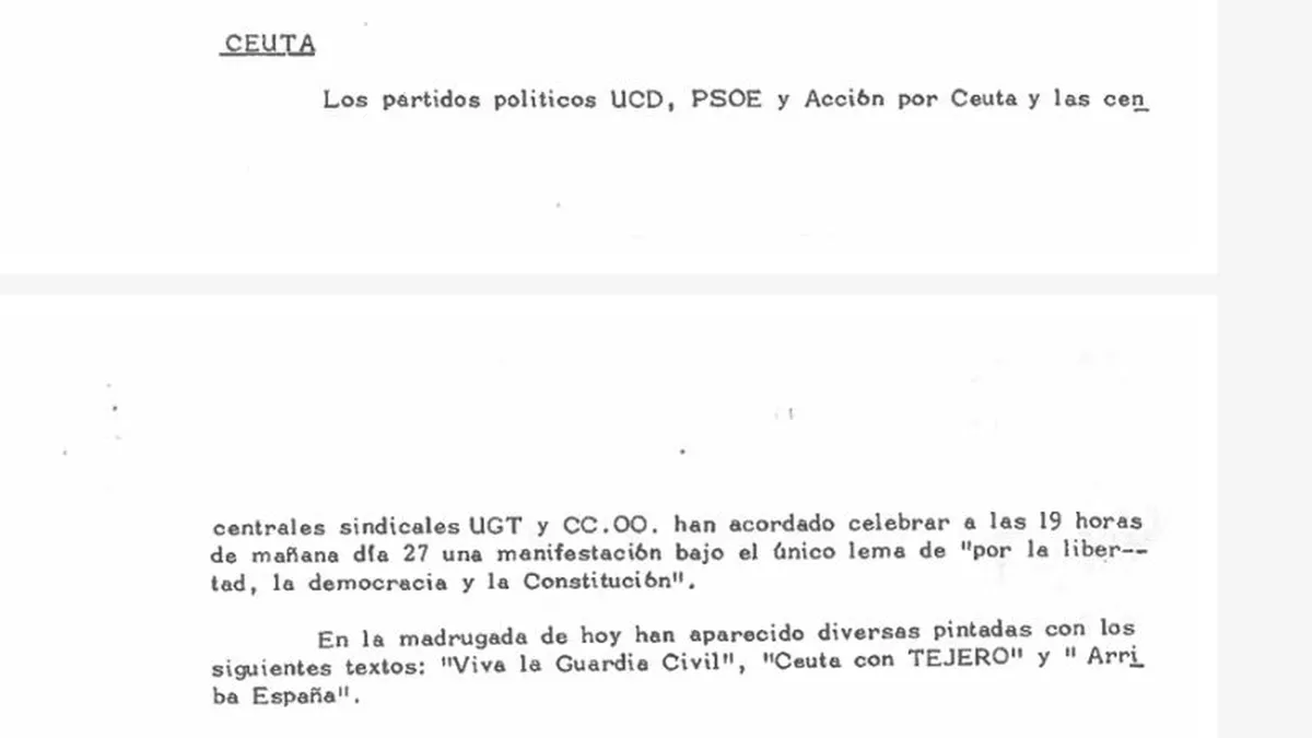 En torno a las 13.00 horas de este miércoles la web oficial del Ejecutivo central, La Moncloa.gob.es, ha dado a conocer los documentos desclasificados del intento de golpe de Estado que realizó el teniente coronel Antonio Tejero el 23 de febrero de 1981 en el Congreso de los Diputados en Madrid. Hasta el momento este diario solo ha encontrado una mención explícita a Ceuta en un informe policial que recoge varias consecuencias en la ciudad autónoma de la tentativa del derrocamiento de la democracia española tres días después del 23F: el anuncio de una próxima manifestación en favor de la Constitución para el día 27 del mismo mes y la existencia de pintadas progolpistas apoyando al militar y a la Guardia Civil.
