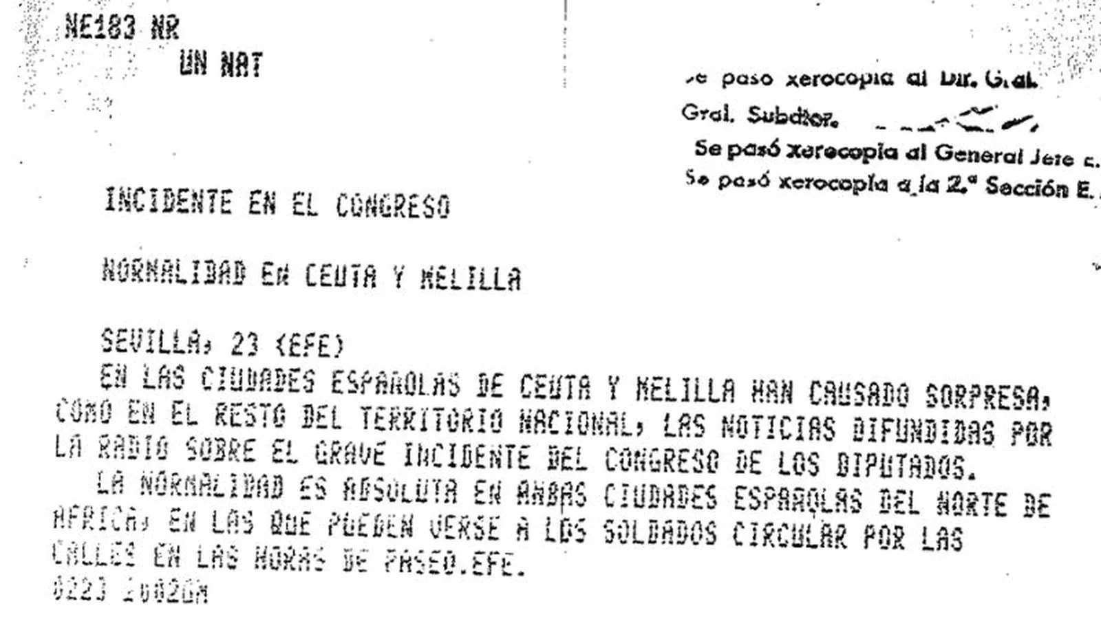 “En las ciudades españolas de Ceuta y Melilla han causado sorpresa, como en el resto del territorio nacional, las noticias difundidas por la radio sobre el grave incidente en el Congreso de los Diputados. La normalidad es absoluta en ambas ciudades españolas del Norte de África en las que pueden verse a los soldados circular por las calles en las horas de paseo”, reza la siguiente información textualmente, a las que siguen textos similares procedentes de Galicia y de León de la misma agencia.