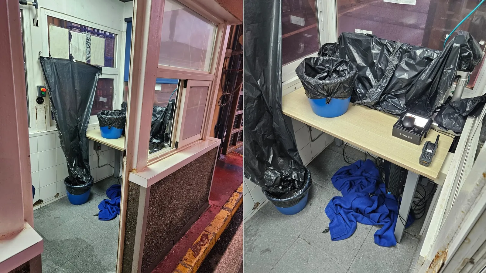 Los sindicatos también han denunciado las condiciones insalubres en las que desempeñan su labor los policías, obligados a trabajar en espacios de cristal rodeados de plásticos, humedad y filtraciones constantes, un entorno que consideran incompatible con cualquier normativa de seguridad laboral.