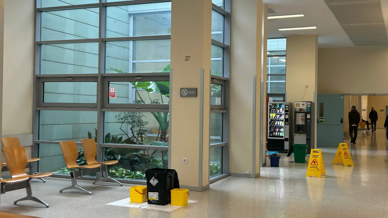 En el HUCE, la situación es especialmente preocupante en el edificio de Consultas Externas, donde las goteras se reparten por cada rincón. Una de las incidencias más graves se localiza a las puertas de los quirófanos, donde una rotura de grandes dimensiones en el techo está provocando filtraciones constantes que se extienden hasta la tercera planta, en el área de Obstetricia. Algunas paredes de esta zona presentan desprendimientos visibles a causa de la humedad acumulada y las precipitaciones, una imagen que se repite también en varias consultas del mismo edificio.