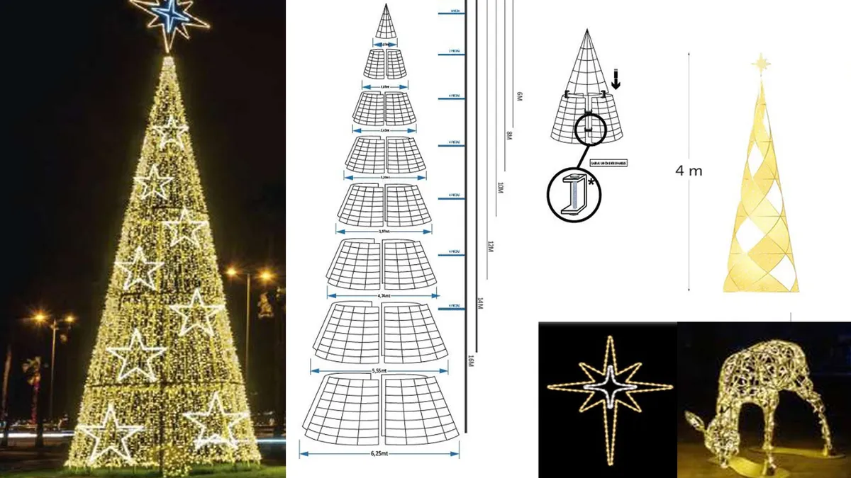 El contrato también prevé la instalación de un árbol navideño exterior de 16 metros de altura y 6,25 metros de anchura, con estructura metálica desmontable, iluminación de conos LED cálidos con copos y estrellas de neón y flashes, además de una estrella superior de dos metros. El peso estimado de esta estructura es de 2.078,41 kilogramos y se fabricará en acero galvanizado o aluminio con certificación de seguridad que garantice su carácter autoportante en espacios al aire libre.