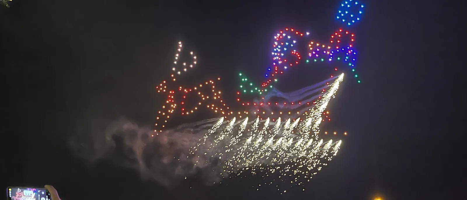 Cada pase del espectáculo cuenta con la participación de 300 drones y 24 pirodrones, que mediante coreografías aéreas sincronizadas y sistemas LED RGB de alta potencia son capaces de formar figuras dinámicas visibles a más de un kilómetro de distancia. Los pirodrones, con efectos de chispa fría, aportan intensidad visual al show en un formato seguro y respetuoso con el entorno.