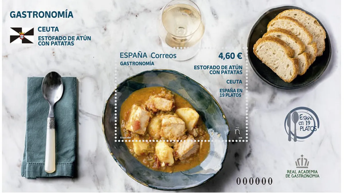 Este guiso marinero, sencillo en apariencia pero lleno de sabor, "encarna la esencia de la cocina ceutí: una fusión entre la tradición mediterránea y los aromas del norte de África. Nacido en los hogares de pescadores, el estofado de atún con patatas se ha convertido en símbolo de identidad culinaria en la Ciudad Autónoma. La receta, basada en ingredientes básicos como atún fresco, patatas, cebolla, tomate y especias, destaca por el equilibrio entre el dulzor de la patata y la intensidad del pescado, especialmente en primavera y verano, cuando el atún rojo está en su mejor momento", indican desde Correos.