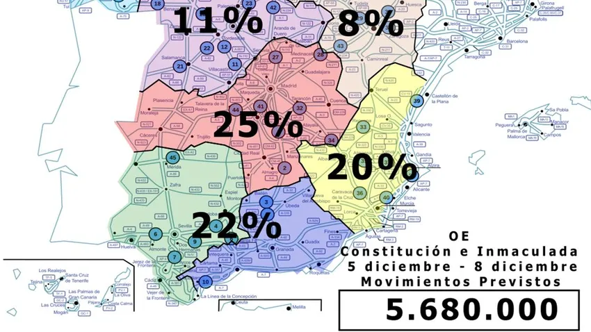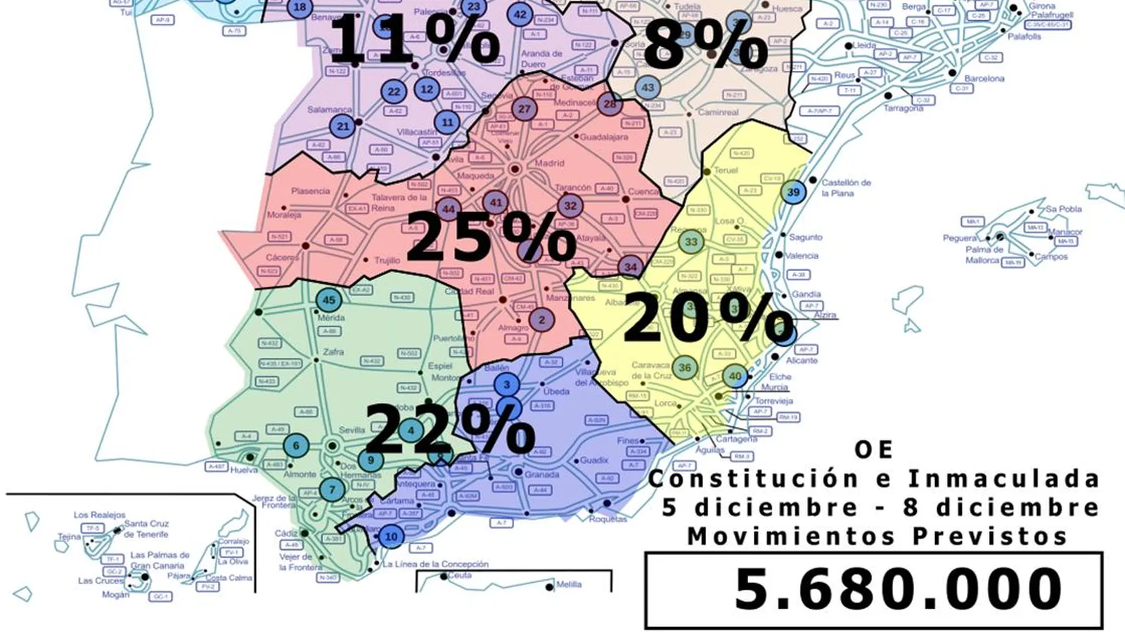 Este viernes 5 de diciembre a las 15:00 arranca el dispositivo especial de regulación, ordenación y vigilancia del Tráfico que la Dirección General de Tráfico (DGT) ha preparado con motivo del puente de la Constitución-Inmaculada y que estará activo hasta la medianoche del lunes 8 de diciembre. En estos tres días de descanso y ocio, muchos ciudadanos aprovecharán para realizar viajes por carretera y se producirán casi 5,7 millones de desplazamientos de largo recorrido, que afectarán a las vías cuyo destino sean segundas residencias, zonas turísticas de descanso o ciudades con tradición navideña.