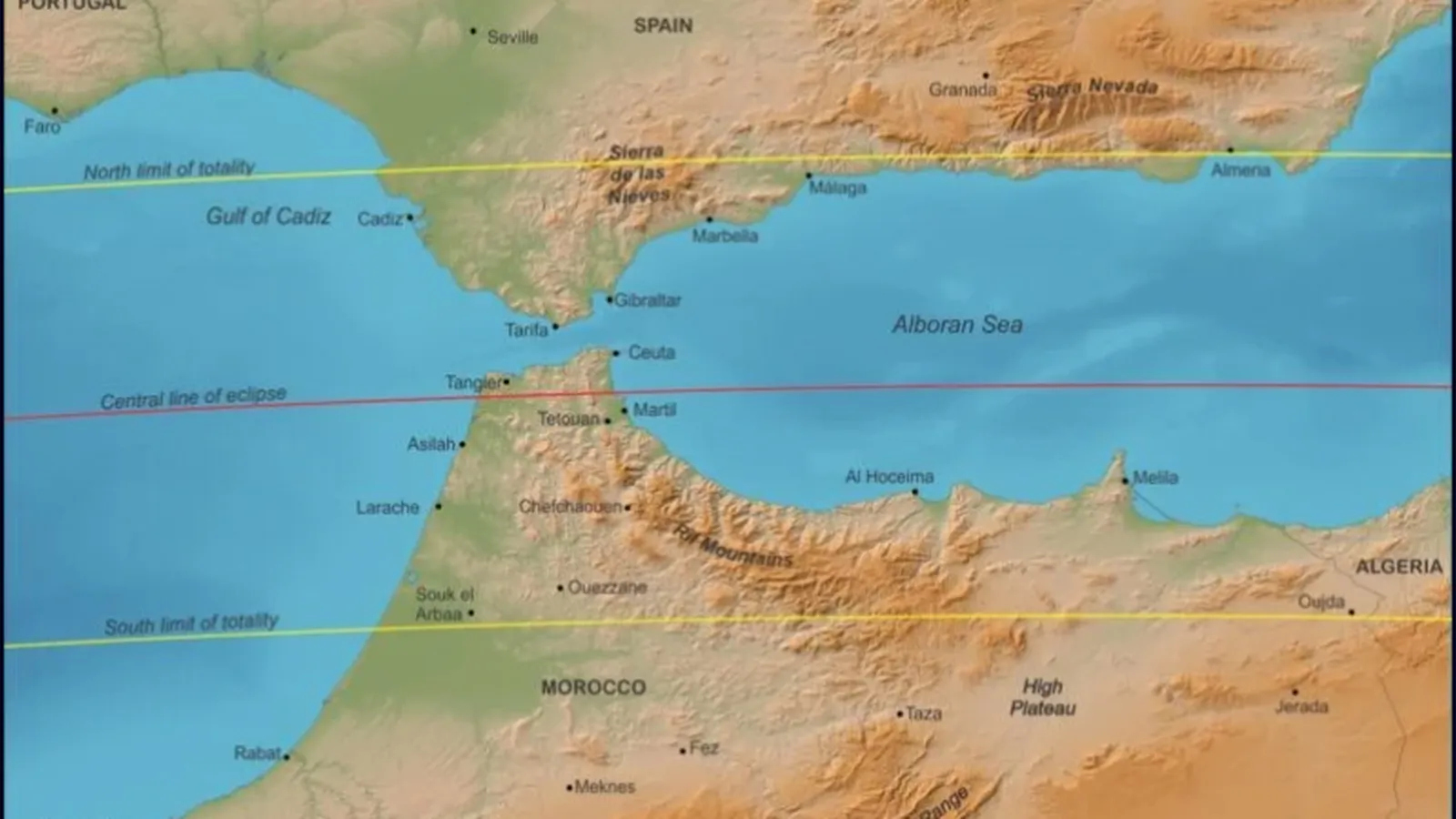 La franja de sombra que creará el eclipse total “ceutí” arrancará en el Océano Atlántico para cruzar el Estrecho de Gibraltar, continuar por la costa norteafricana, cruzar el Mar Rojo para terminar en el Océano Índico. El fenómeno se iniciará a las nueve y media de la mañana y concluirá poco más de cinco horas después. En Ceuta, se estima que el eclipse durará algo más de cuatro minutos y medio.