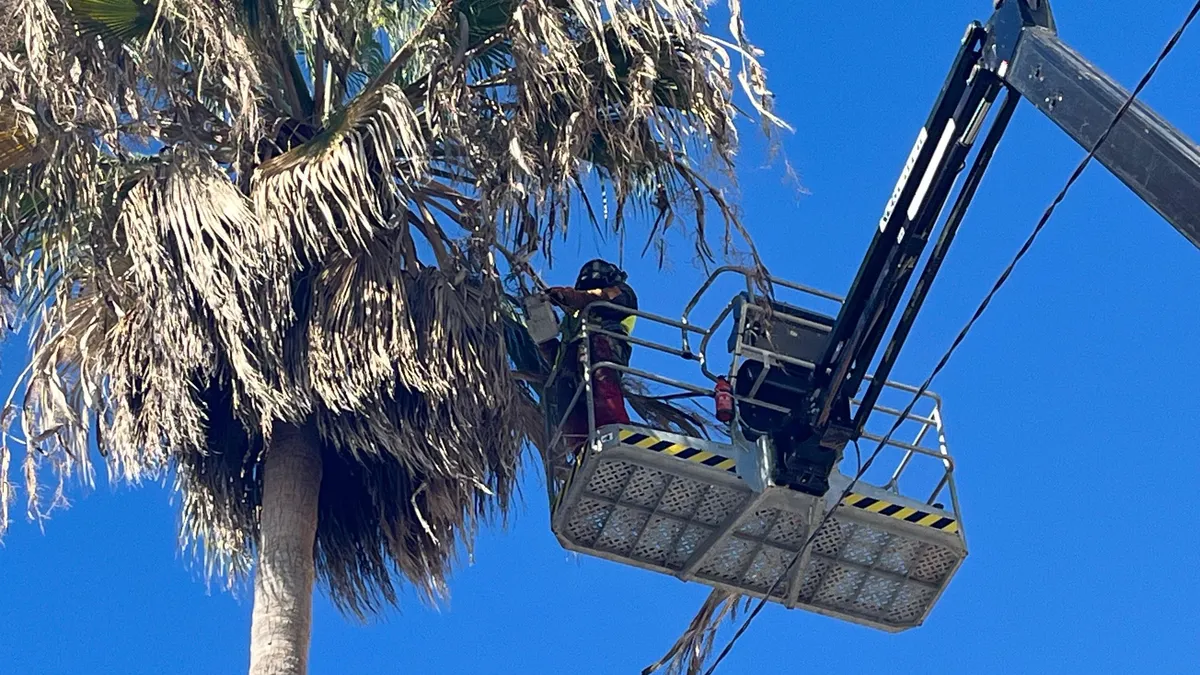 Los jardineros de Tragsa continúan la poda de palmeras en la calle Independencia