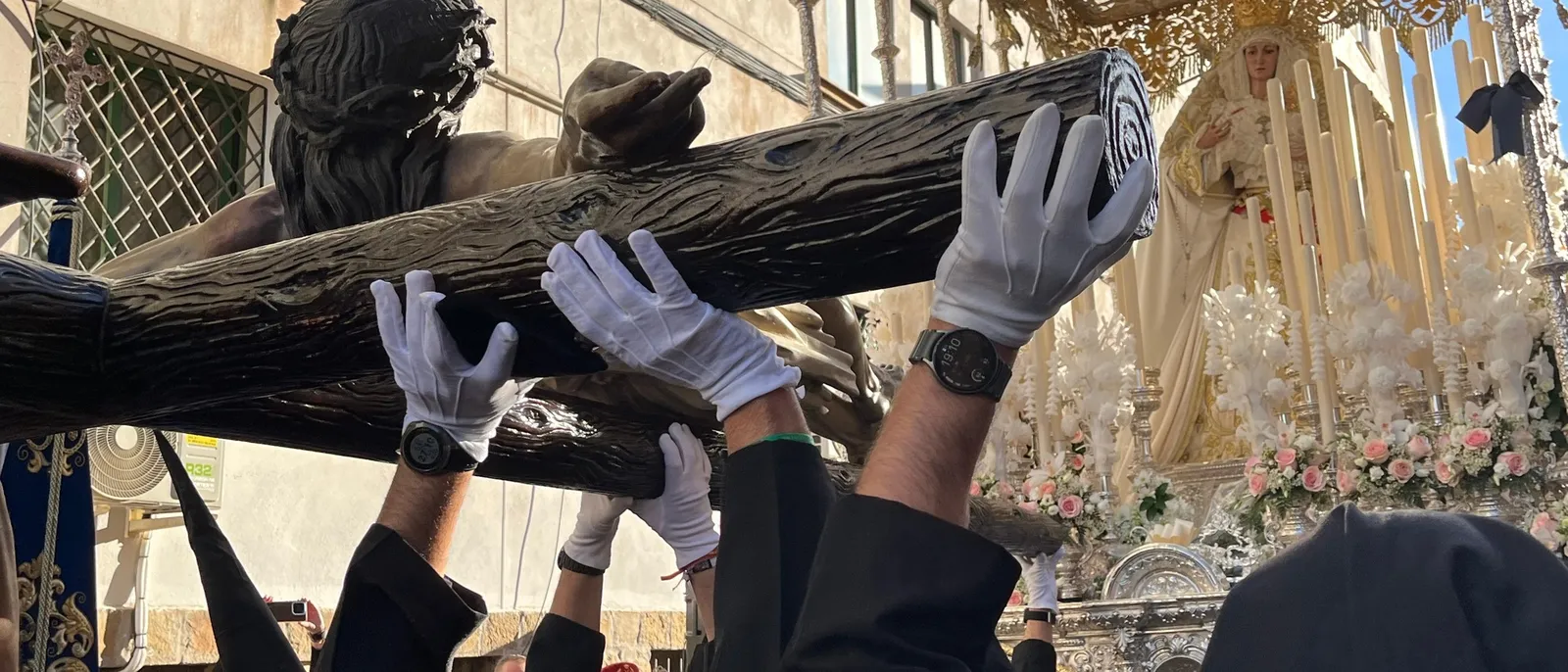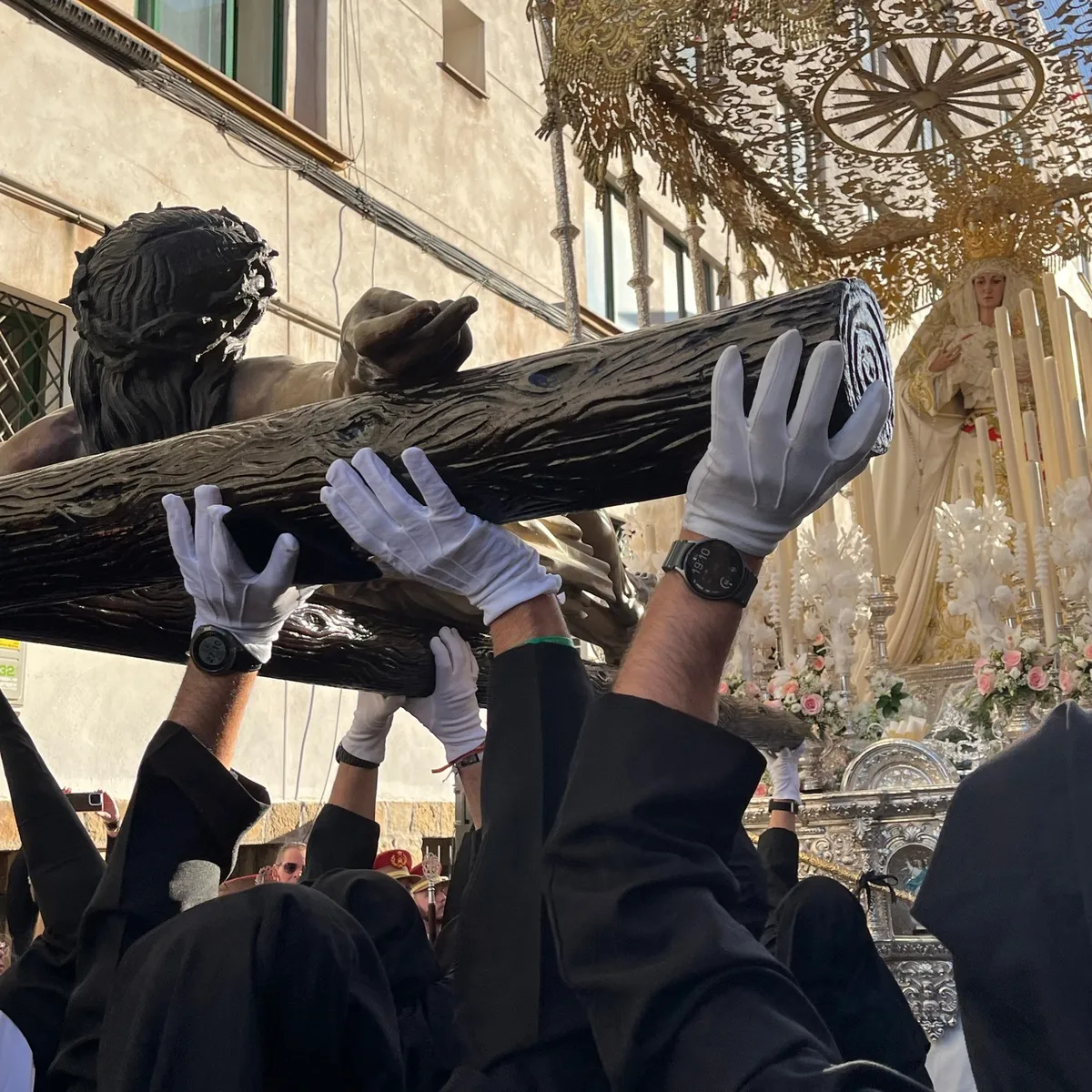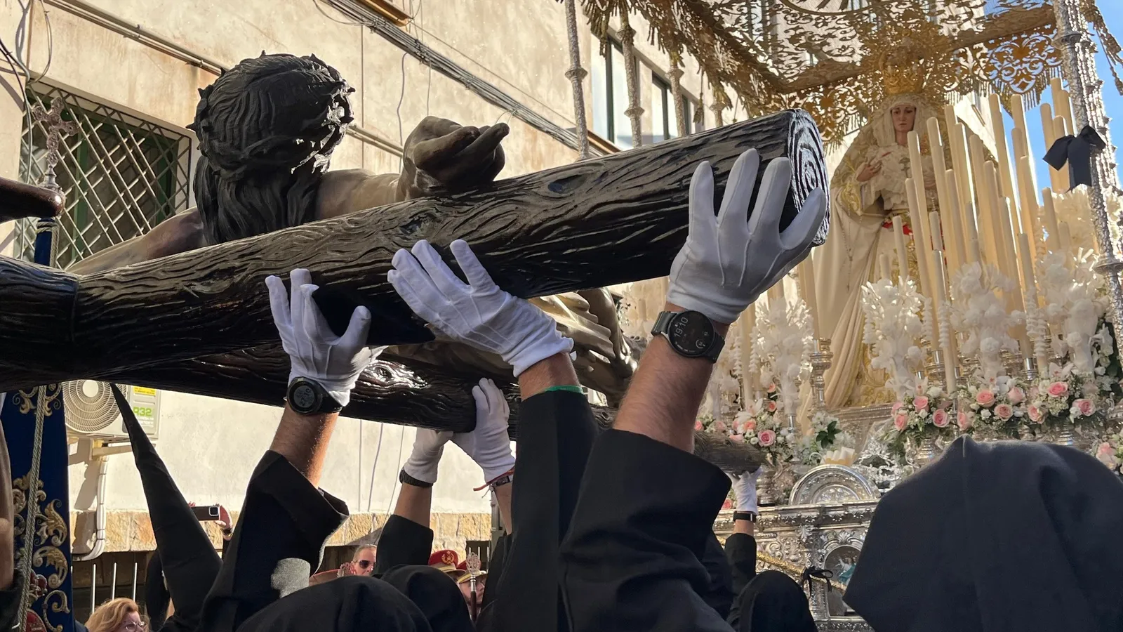 Una cofradía que este año estrena recorrido, por aquello de las obras que son tema de conversación monotemático en el barrio. Si este cambio será definitivo o lo vivido en la tarde del Jueves Santo un momento para la historia por irrepetible, es algo que tendrá que decidirse por parte de la Junta de Gobierno cuando corresponda. No cabe duda de que este recorrido alternativo tiene algo distinto, algo especial. Por ejemplo, el paso por Bermudo Soriano, con petalada incluida. La entrada por Calle Nicaragua deja una complicada ‘revirá’ al principio, que obliga a los costaleros a dar lo mejor de si. Luego transita por Calle Nicaragua hasta que se produce el tradicional pregón encuentro junto al cuartel de la Guardia Civil. Es el padre Joseph, de Santa Teresa, el encargado de reflexionar sobre el significado de la muerte de Cristo, antes de que Josele Santiago vuelva a emocionar, otro año, con su saeta.