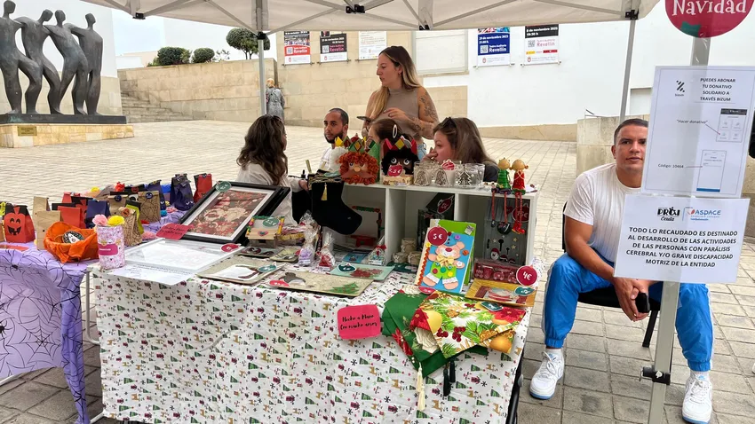 Estas obras han salido a la calle en la mañana de este lunes, con un stand a la entrada de la Plaza Nelson Mandela. Según Jesús Márquez, educador social, "el objetivo de poder recaudar fondos a través de un mercadillo solidario en el que exponemos y mostramos algunas manualidades que han realizado los chicos y también hay artículos que han donado y han realizado una de las familias del PROI, que es Nieves Guerrero y su hermana. El objetivo es recaudar fondos para la entidad para poder utilizarlo para las terapias y actividades que desarrollamos a lo largo del año".