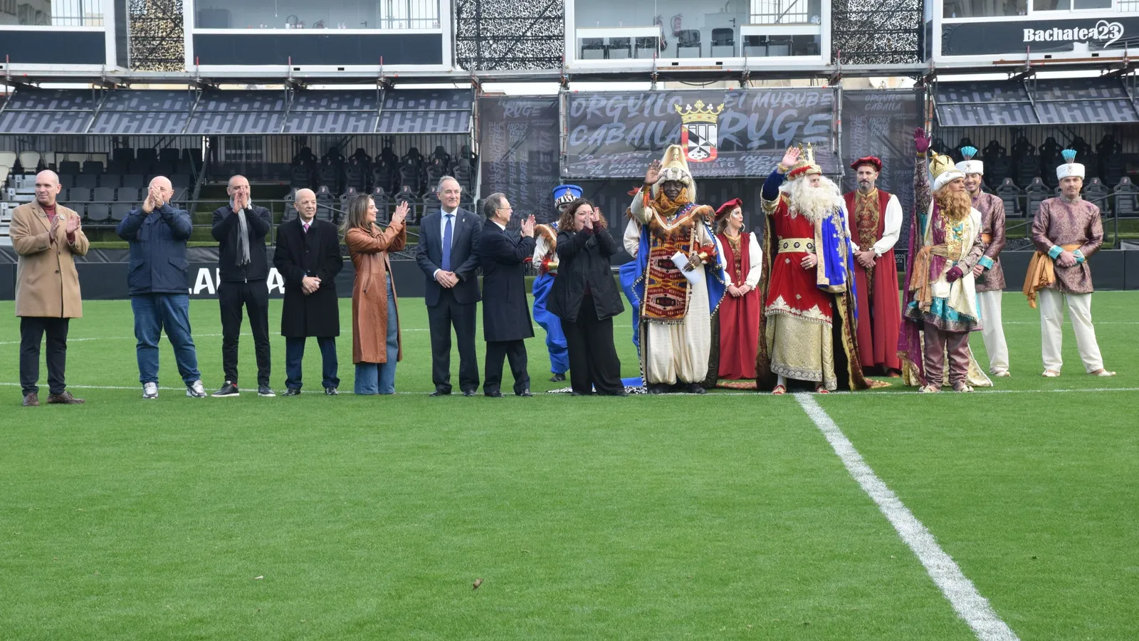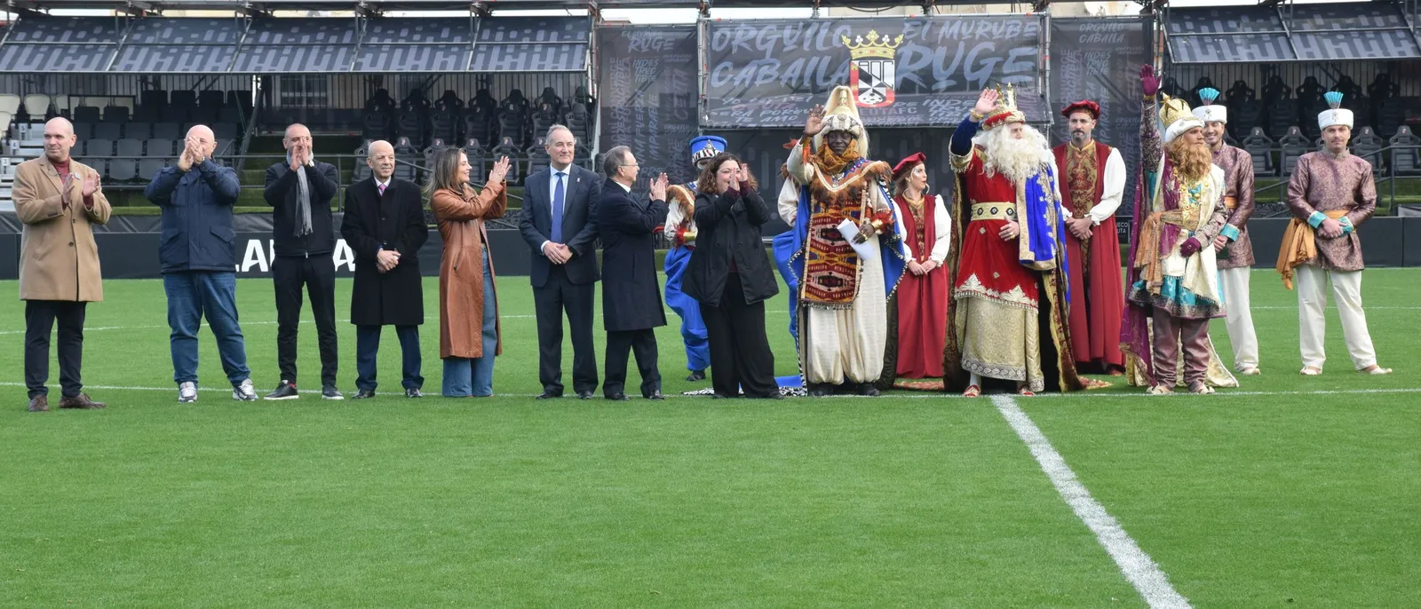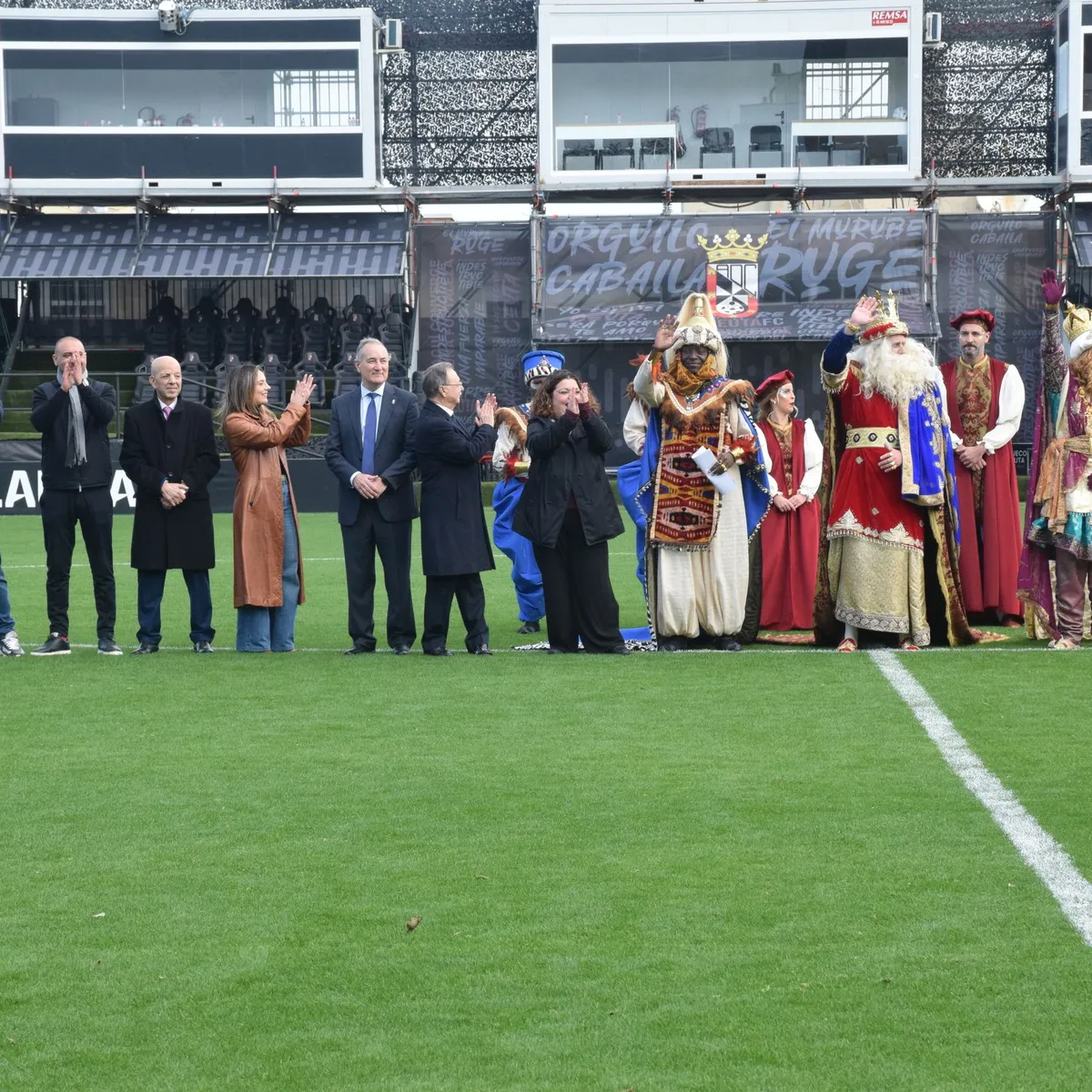 CEUTA/ Decenas de personas acudieron este lunes al estadio Alfonso Murube, donde los Reyes Magos de Oriente aterrizaron sobre las 11.30 horas, unas horas antes del inicio de la cabalgata, prevista para las 19.00 horas con salida desde la calle Maestranza y final en la plaza de África. El presidente de la Ciudad Autónoma, Juan Vivas, asistió al acto acompañado por miembros del Gobierno local como Nicola Cecchi y Pilar Orozco, además de la delegada del Gobierno, Cristina Pérez, y el presidente de la AD Ceuta FC, Luhay Hamido. La jornada festiva coincidió, además, con el buen momento deportivo del conjunto caballa tras la victoria por 2-1 ante el Andorra, que sitúa al equipo en puestos de ‘playoff’ de ascenso.