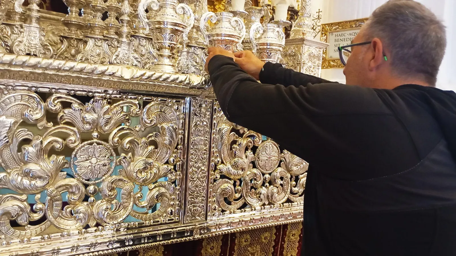 "Esto es lo que nadie ve. La gente tiene asimilado que los pasos están impolutos y limpios todo el año, y que poner una cofradía en la calle se hace con dos semanas de antelación. No es así; tenemos que estar previamente limpiando y preparando cada detalle, por pequeño que parezca". Así nos lo dicen un par de hermanas de la Expiración. "Llevamos toda la semana terminando en nuestros trabajos y viniéndonos aquí hasta que cierra la iglesia", nos dice otra. Este jueves "no sabemos cuantas horas echaremos". A menos de medio metro, los Obispo, padre e hijo, se 'pelean' con algún clavo que se resiste a entrar.
