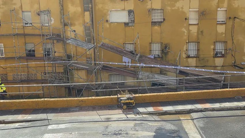 Un andamio se desprende de la fachada de dos bloques de viviendas en Príncipe Felipe